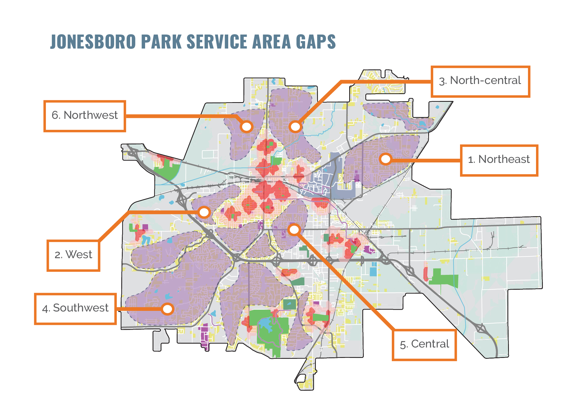 In primarily built-out communities, the challenge is not increasing park acreage but improving access and enhancing existing spaces. For example, the City of Plano in Texas is roughly 97% developed; in the latest iteration of their master plan, an emphasis was placed on improving walkable access to parks and finding opportunities for green space within underserved areas.